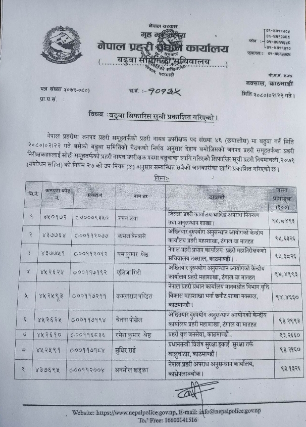 नेपाल प्रहरीका ४६ इन्स्पेक्टरको डीएसपीमा बढुवा सिफारिस