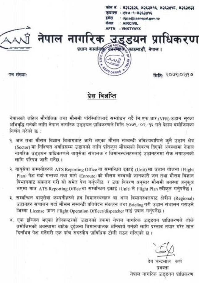 • अबदेखि मौसम सफा नभई उडान भर्न नदिने प्राधिकरणको निर्णय