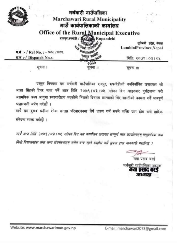 रुपन्देही जिल्लाको मर्चवारी गाउँपालिकाकी उपाध्यक्ष आशा सिंहका देवरको दुर्घटना परी आज  मृत्यु भएकोमा श्रद्धाञ्जली अर्पण गर्दै शोकको घडीमा गाउँपालिकाभरका सबै वडा कार्यालय, सबै विद्यालयहरु तथा संघसंस्थामा विदा दिएको छ ।